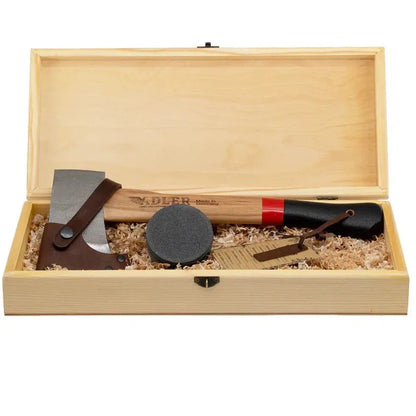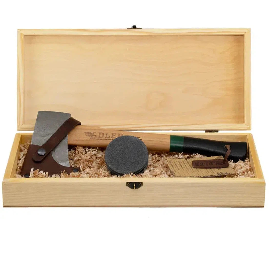 Classy gift set consisting of a hatchet (choose from Rheinland or Yankee hatchet), sharpening stone and real wood box.