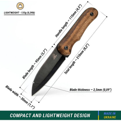 This fixed-blade knife boasts a full-tang construction, offering exceptional strength and resilience. The handle material, European walnut, exudes elegance while providing optimal grip and comfort during extended usage. The handle scales are fixed with two rivets and can be replaced.