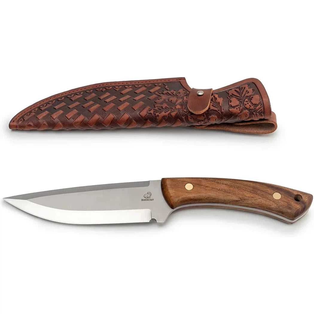 The handle of this hunting knife is made from premium walnut and features an ergonomic design. It provides a comfortable and secure grip, and the knife's full-tang design offers extra durability. The handle is firmly secured with brass rivets, giving it a sturdy, non-dismountable design.