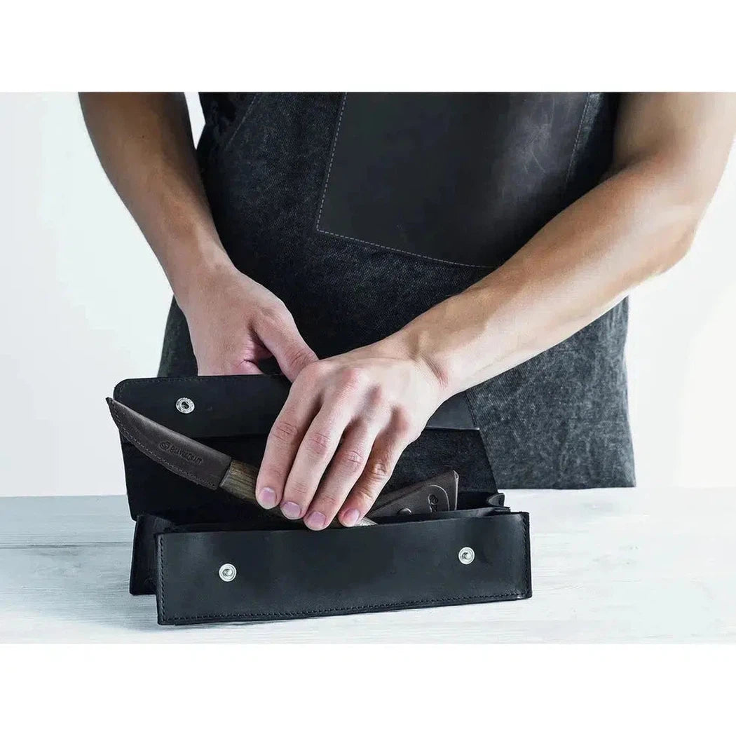 Experience the convenience of an all-in-one woodcarving kit. Everything you need for spoon carving is neatly stored in a stylish black leather roll-up bag, protecting your precious tools during transport.