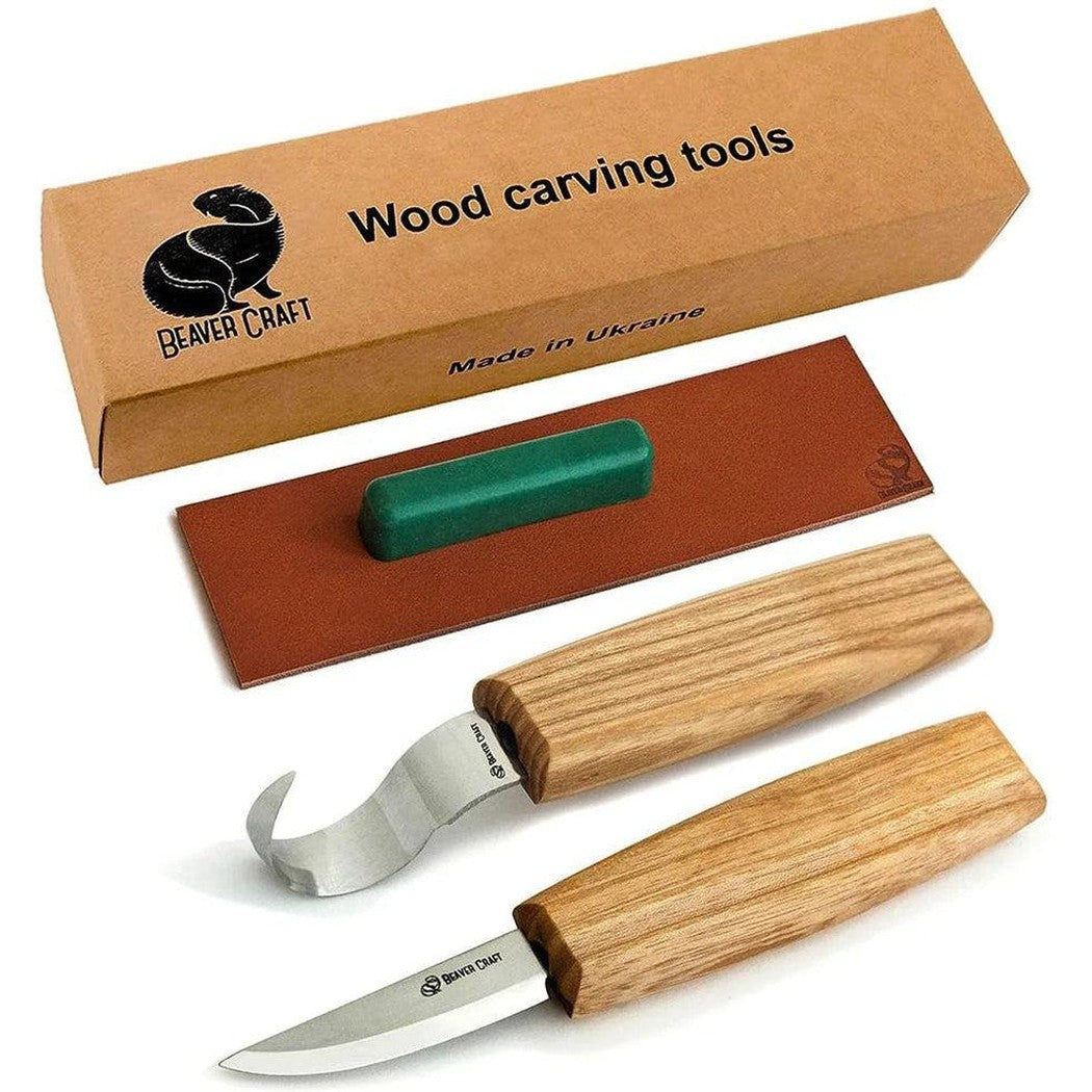 Spoon carving tools set is ideal for cutting spoons from a wood. This set includes a whittling knife and wood carving spoon hook knife. With the whittling knife, you give shape to the spoon, then with the hook knife, you cut out the spoon and smooth wood out and that's all, your spoon is ready. The wood carving tools for cutting wooden spoons are made from durable high carbon steel and well sharpened, which allows you to cut soft and hardwood. Handles are made from Ashwood and covered with linseed oil. Leather strop with green-grey polishing compound are included to keep your blades razor-sharp.