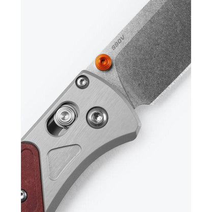 We decided to mix it up a little bit with this premium Bugout® and, like, literally mix some materials. Inspired by the earthy tones found in our outdoor gear, backpacking kits, and accessories around the campsite, the new 535-09 Bugout® sets itself apart from others we've built thanks to handle scales that contrast a gray anodized 6061-T6 aluminum bolster with a Redstone Richlite onlay, plus a few other added pops of color found in the orange anodized thumb stud and backspacer. Featuring a premium CPM-S90V stainless steel stonewash polished blade, this unique 535-09 Bugout® has the same stunningly lightweight and compact feel as its predecessors and remains the ideal EDC on any outdoor adventure from the mountain trail to tasks around town.