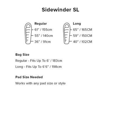 Specifically designed for those who sleep on their sides, the patent pending Sidewinder Series was engineered to ensure warmth, comfort, and ease of use no matter which side you're on. Constructed with features you expect from a traditional mummy bag with additional body mapped insulation to optimize warmth where you need it and minimize pressure points and other side effects. The Sidewinder SL is a side sleepers dream bag with technical features that roll seamlessly from one adventure to the next, and from one side to the other at night.
