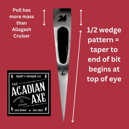 We honor the Acadians, those hearty French Canadians, who tamed the north woods of Maine and Eastern Canada, with our new half wedge axe. Coming in at 2.75 lbs. and hung on a 30" Amish-turned hickory handle, it is a little beefier than our Allagash Cruiser so go ahead and tackle those bigger projects.