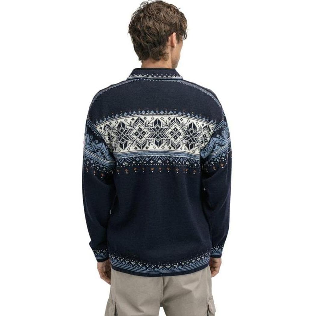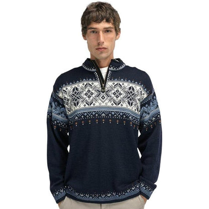 The Blyfjell is a best-selling men's sweater rooted in timeless Norwegian tradition. Made from 100% lightweight wool, it offers natural warmth and comfort while featuring a quarter-zip neckline with a fleece-lined collar for added softness. The intricate design showcases classic Norwegian folk patterns, including variations of the iconic eight-petal rose - a symbol of Norwegian heritage and artistry.