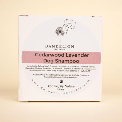 We can't wait for you to try these! They are 100% natural with a tallow base and are safe for your furry friends! The scent on this bar is made with an essential oil blend of Cedarwood, Lavender, & Frankincense. We also add ground oatmeal & calendula flowers and honey for extra nourishment for your friends skin and hair.