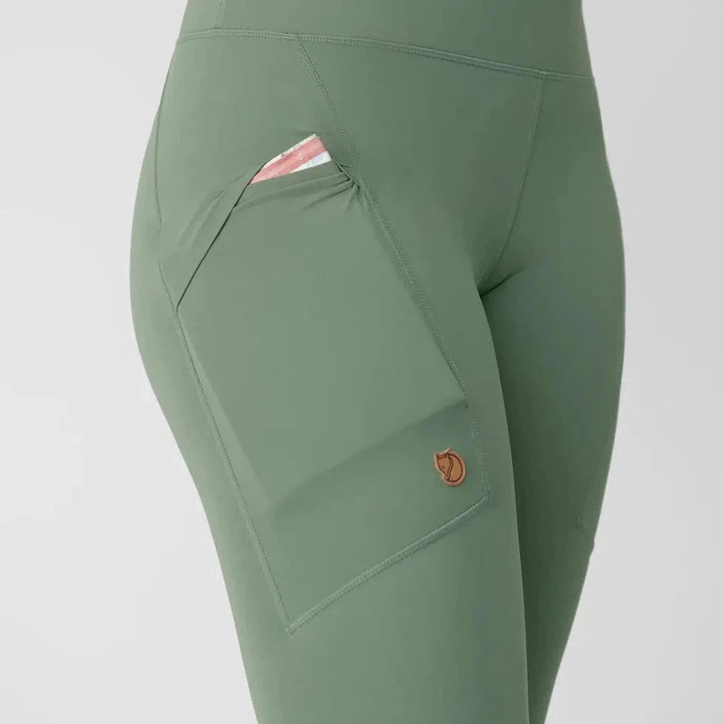 Sustainable, comfortable and attractive, what's not to love about our Abisko Tights? Created from a moisture wicking stretch fabric in recycled polyester, they give a secure, snug feel that is further emphasized by the high waistband. We have also positioned the seams and designed the pockets for a flattering fit. Perfect for hiking and everyday outdoor life the 7/8-length is easy to combine with socks and hiking boots.