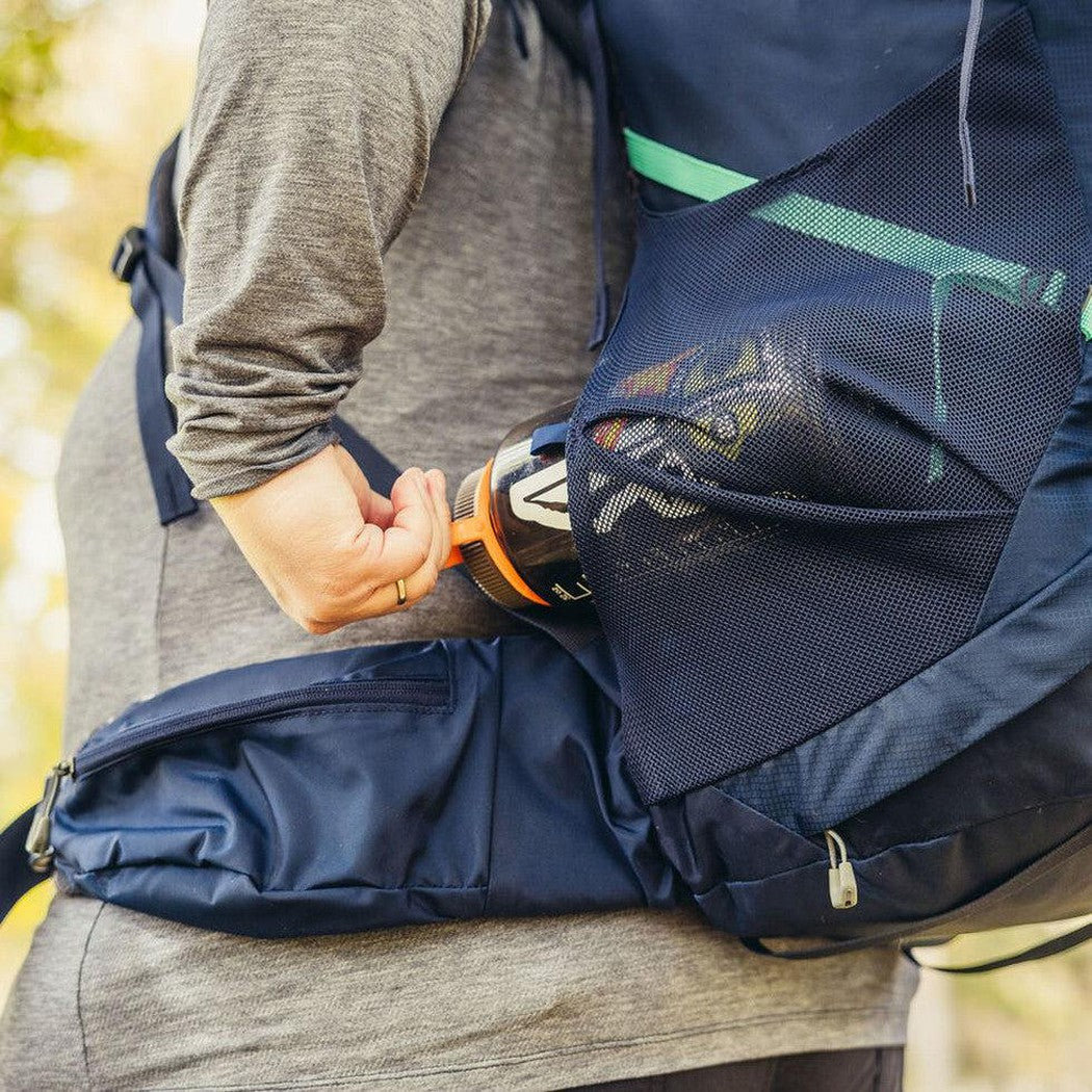 - Dual-side mesh pockets featuring side trail access with top and bottom compression straps