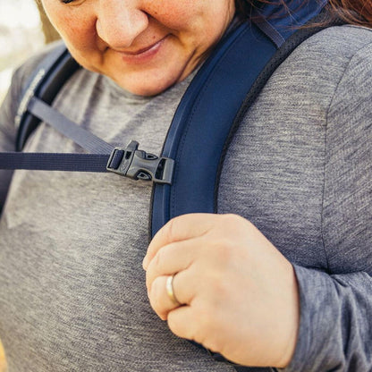 - Perforated, breathable shoulder harness with sternum strap featuring an integrated safety whistle