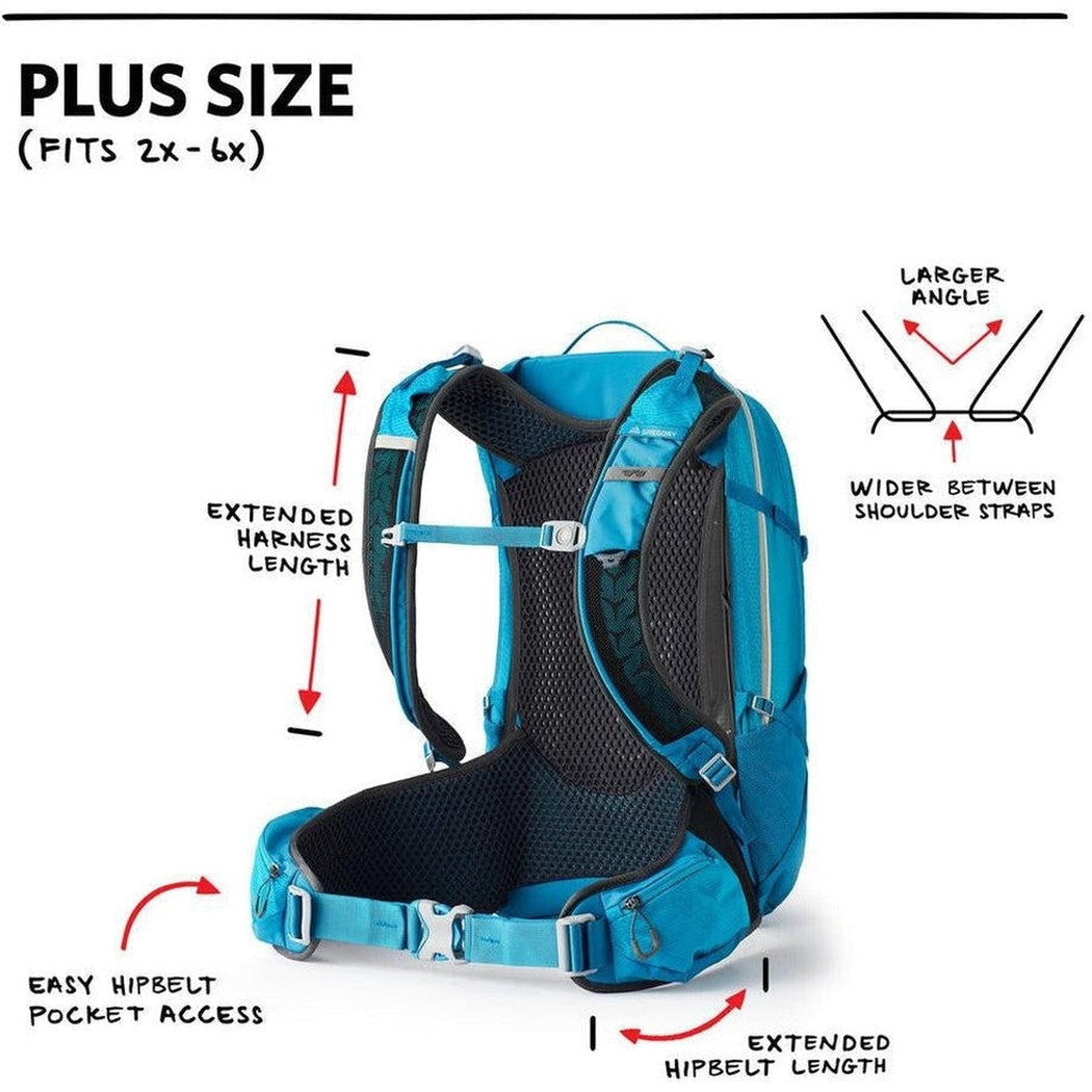 - Plus Size fit is comparable to 2x-6x in apparel sizing and the torso sizing remains consistent with all other Gregory products. See our Fit Chart for complete fit dimensions.