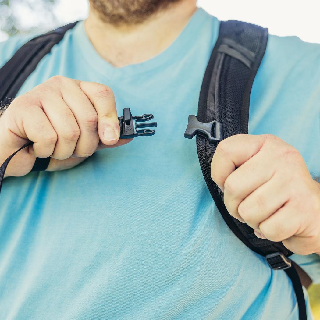 - Airmesh breathable shoulder harnesses with one-handed sternum strap buckle and hydration routing loops