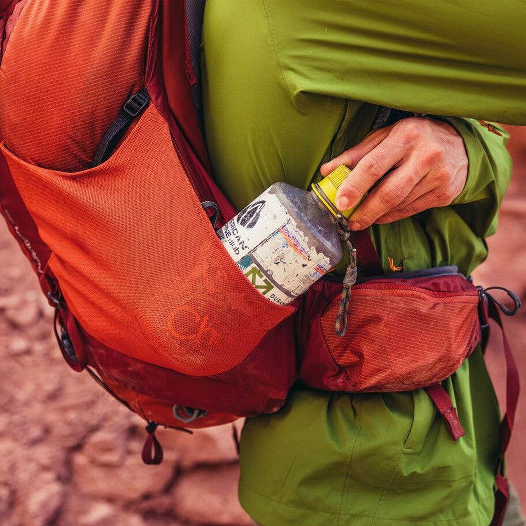 • Dual side stretch mesh pockets, one with side trail access, with pass through for over or under compression