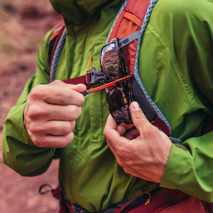 Quickstow system on shoulder harness for a secure, scratch-free way to store your sunglasses