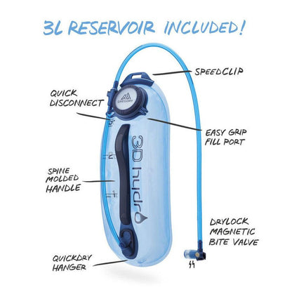- Includes 3D Hydro quick-drying, soft-molded reservoir (3 Liter) with integrated drying hanger and Spine molded handle for easy refills