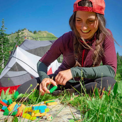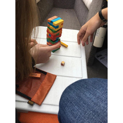 Our compact tumbling tower stands only 6.25" tall when assembled. Small enough to take with you anywhere. A stacking game of skill and balance. Take turns removing and restacking the blocks without tumbling the tower. Use the dice to add more fun!