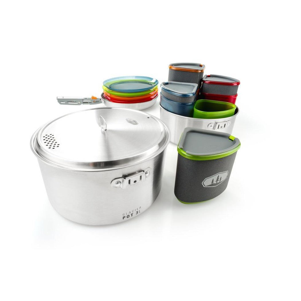 - Four-person system includes: 3L pot, 2L pot, 9" fry pan, strainer lid, four 14oz mugs with insulated sleeves and sip through lids, four 14oz bowls, four 7.5" plates, folding pot gripper, welded storage bag/sink