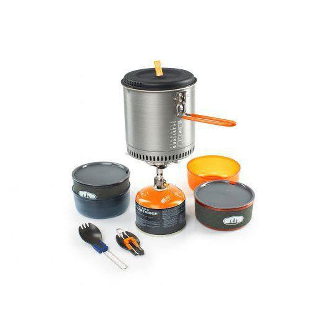 Built for maximum cooking efficiency, and designed to carry light and pack small, this is our highest performance two-person backpacking system and stove. The rugged, hard-anodized aluminum 1.8L boiler is coated with durable, scratch-resistant PFOA-free Teflon® with Radiance Technology for superior non-stick performance, easy cleaning, and outstanding heat transfer. Then we added our hyper-conducting heatsink to speed cook times by 30% so you save fuel and time. The kit also includes all your eating gear and canister stove. Nesting perfectly into the pot with room for your fuel canister are two 20oz wide-mouth mugs with insulated sleeves and Sip-It lids, two 20 oz bowls, and a couple of Foons our folding spork and our Pinnacle Canister Top 10,000 BTU Stove. The pot strainer lid makes draining easy, and the whole system fits into a carry bag that doubles as a camp sink.