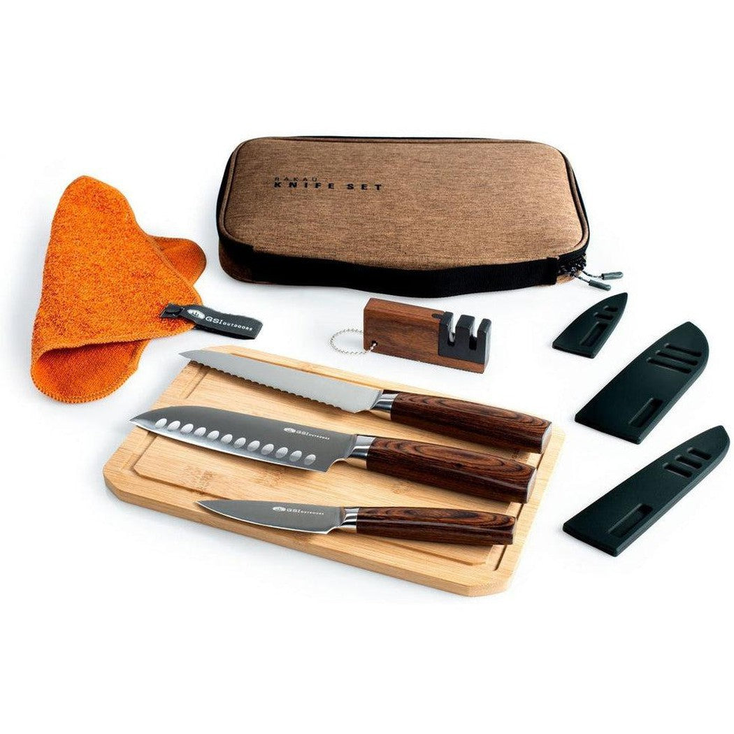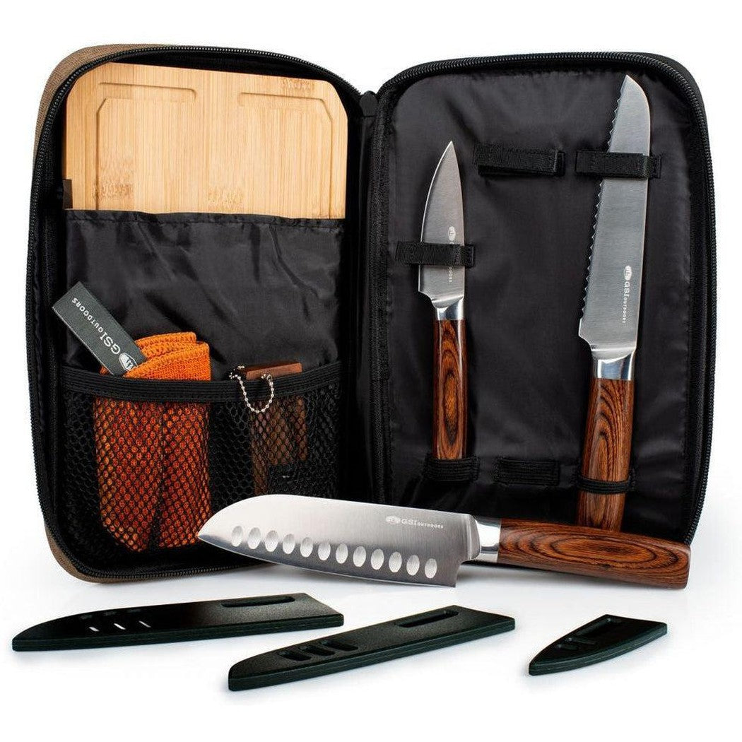 - Camp kitchen knife set includes: 3.5" Paring Knife with Sheath, 6" Santoku Chef's Knife with Sheath, 6" Serrated Bread Knife with Sheath, Bamboo Cutting Board, Dish Cloth, knife sharpener, rPET Cloth Case