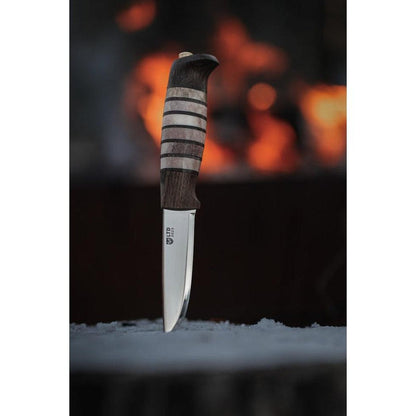 The Rein is of course built with the image of a Reindeer in mind. These are large, gracious animals that are ideally suited to life up north. The colours in the knife mirror those of the reindeer - earthly tones split by variations in white. The knife features a scandi grind, 9 cm highly polished blade in our laminate H3LS steel. The composite handle has an ample belly built by equal parts leather and reindeer antler inlets, framed by a front and back piece in dark oak. The shape is that of a classic, Norwegian outdoor knife, ideally suited to most things you need a knife for when venturing out either for your Sunday trip or longer adventures.