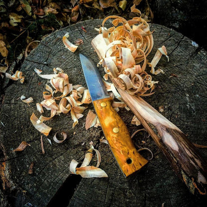 The semi-full tang provides the extra strength associated with bushcraft knives. The triple laminated carbon steel tang is exposed on the top and pommel end, but is covered by the wood of the handle on the finger side. This protects the fingers from direct contact with the steel in cold weather. The blade is made of triple laminated carbon steel that provides excellent edge holding toughness and ease for sharpening. The handle has a bit of a finger guard to help keep your hand off the edge when slippery. The handle shape on the updated version of the Temagami CA allows a better control of the knife when holding in more positions. The Temagami CA comes with a Scandinavian style pouch sheath retains the knife securely without the need for snaps or straps.