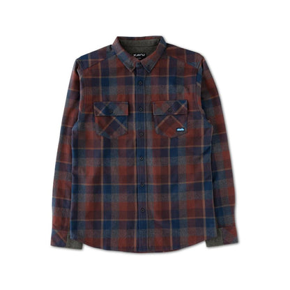 Casual fit, long sleeve button up shirt, stand collar with interior KAVU logo jacquard tape, two chest pockets, curved hem.