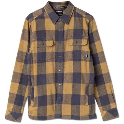 Casual fit, shirt jacket with snap front, stand collar with interior KAVU logo jacquard tape, two chest flap pockets, single welt hand pockets, jersey lined cuffs, split back bias yoke, straight hem with side vents.
