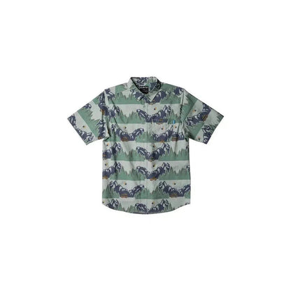 Casual fit, short sleeve button up shirt, stand collar, single chest pocket, dyed to match pearlized buttons with satin finish, back yoke panel with box pleat and locker loop, curved hem.