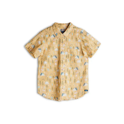 Boyfriend fit, short sleeve button up shirt, stand collar, one chest pocket, 25% certified recycled polyester matte buttons, back yoke panel with center back box pleat, curved hem.