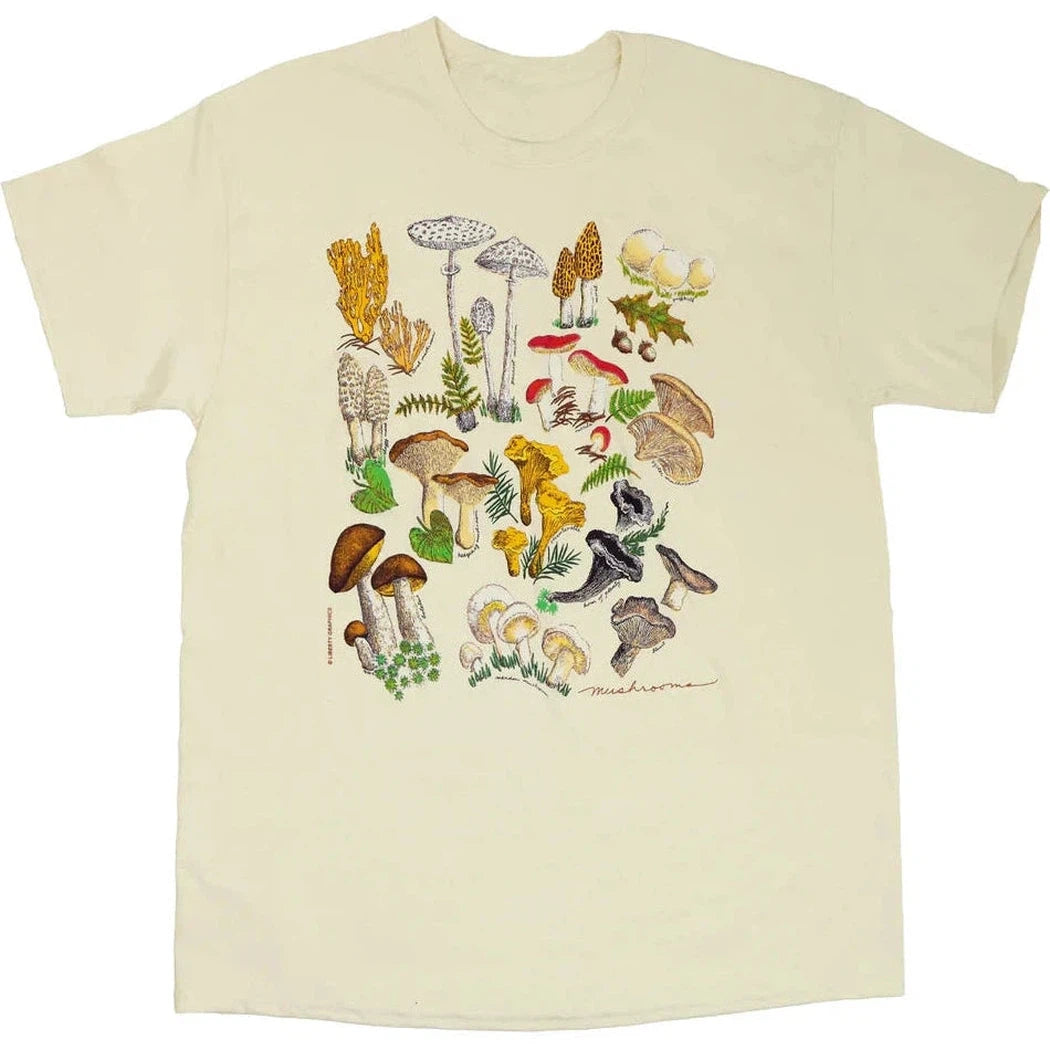 Liberty Graphics presents Mushrooms printed on a 100% cotton Gildan heavyweight Adult t-shirt. Liberty Graphics prints t-shirts using 100% water-based ink for your comfort and our environment. Artist: Ieva Tatarsky.