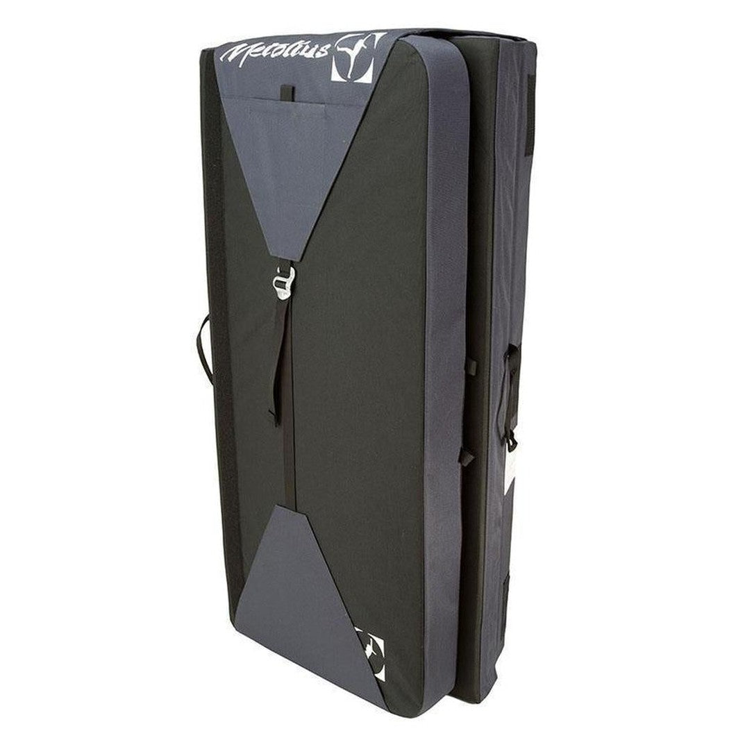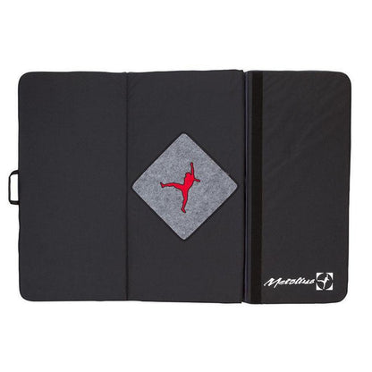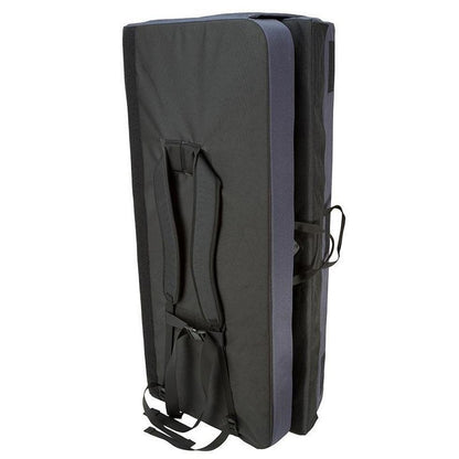 5½ sq. ft. (0.51 sq. m) more landing area than standard-sized pads but almost 4" (100 mm) narrower when folded for a cleaner carry and easier storage. 900d body fabric for maximum durability and cross-clipper logo rug for cleaning shoes. Sandwich foam design for maximum impact absorption: 1" (25 mm) closed-cell top layer, 2½" (60 mm) open-cell center, and ½" (15 mm) closed-cell base layer. Angle cut hinges eliminate the gutter found in other designs. Small external stash pocket and larger inner pocket for shoes, chalk bag, etc., plush padded shoulder straps, dual sets of drag handles, and aluminum buckles that are guaranteed for life. Closure flap reverses to cover shoulder straps while the pad is on the ground.