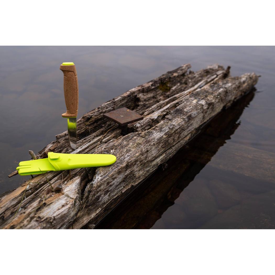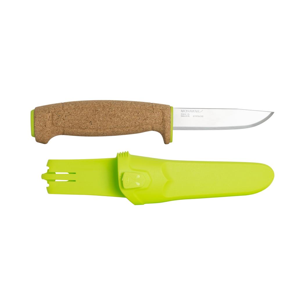 This is a lightweight outdoor knife that floats. The ergonomic barrel-shaped handle of natural cork features a soft friction grip, a sturdy finger guard, and a 1.4 mm thick blade made of recycled Swedish stainless steel.