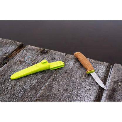 The knife that floats thanks to the natural cork handle weighs only 49 grams and has a 1.4 mm thin blade made of stainless steel. Its lime green color is highly visible in water, making it very easy to locate. Connect the knife to your belt, backpack or lifesaving vest with the clip on the sheath. It's also possible to attach it to a button, for example on your working clothes. The highly visible lime green sheath with a smart button lets you attach and link several knives from our Craft segment, giving you the opportunity to carry your preferred combination of tools that suits you.