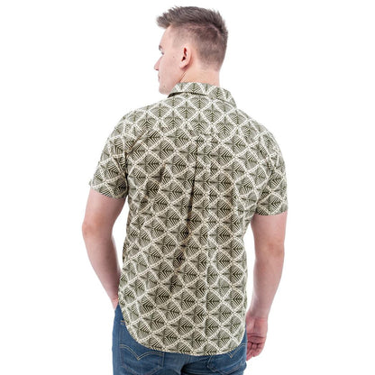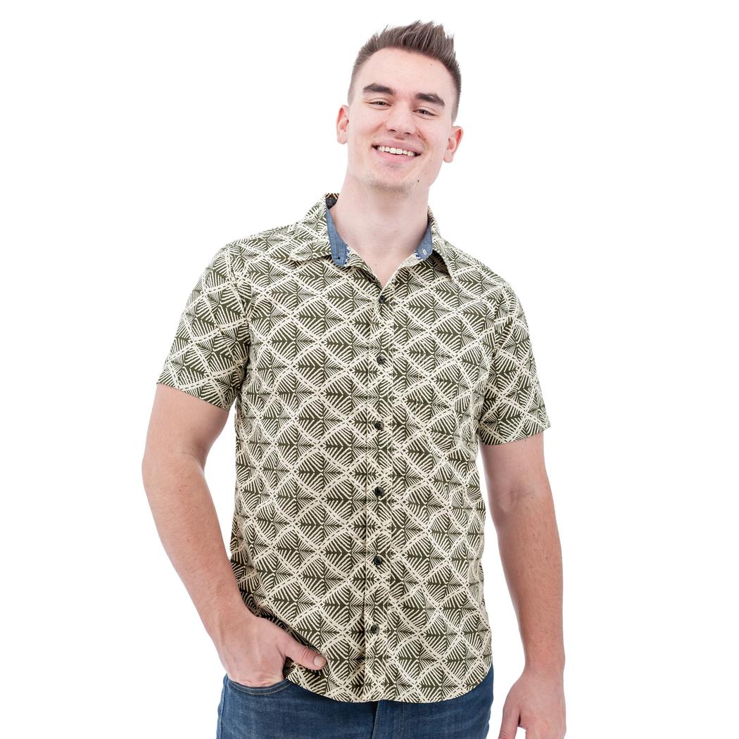 Fans of Old Ranch Brands' design, fit, and fabric will rejoice with the Fair Trade Certified™ Kona Shirt. Another home run style places comfort at the forefront for men who want to look great effortlessly. The secret is in the fabric. This organic cotton and polyester blend has great handfeel, hangs well, is easy to maintain, breathes, and has a crisp, put-together structure with the slightest bit of give. The all-over print pays homage to a tropical escape but is refined, lovely, and easy-going. Classic finishes include a single chest pocket with a pen slot, a box pleat on the back yoke, and a spread collar.