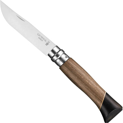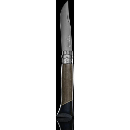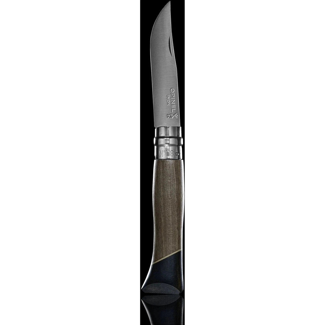 Looking for a way to limit the waste of expensive ebony, the Workshop knife was born! This handle allows us to recover the wood that would have otherwise been scrapped. The result is a mix of walnut and ebony with two veneers bringing these two species together. A 30° cut is made at the heel, then the walnut and ebony are assembled, glued and pressed. Once worked and shaped, the handle is finally buffed just like all the other handles manufactured in this workshop.