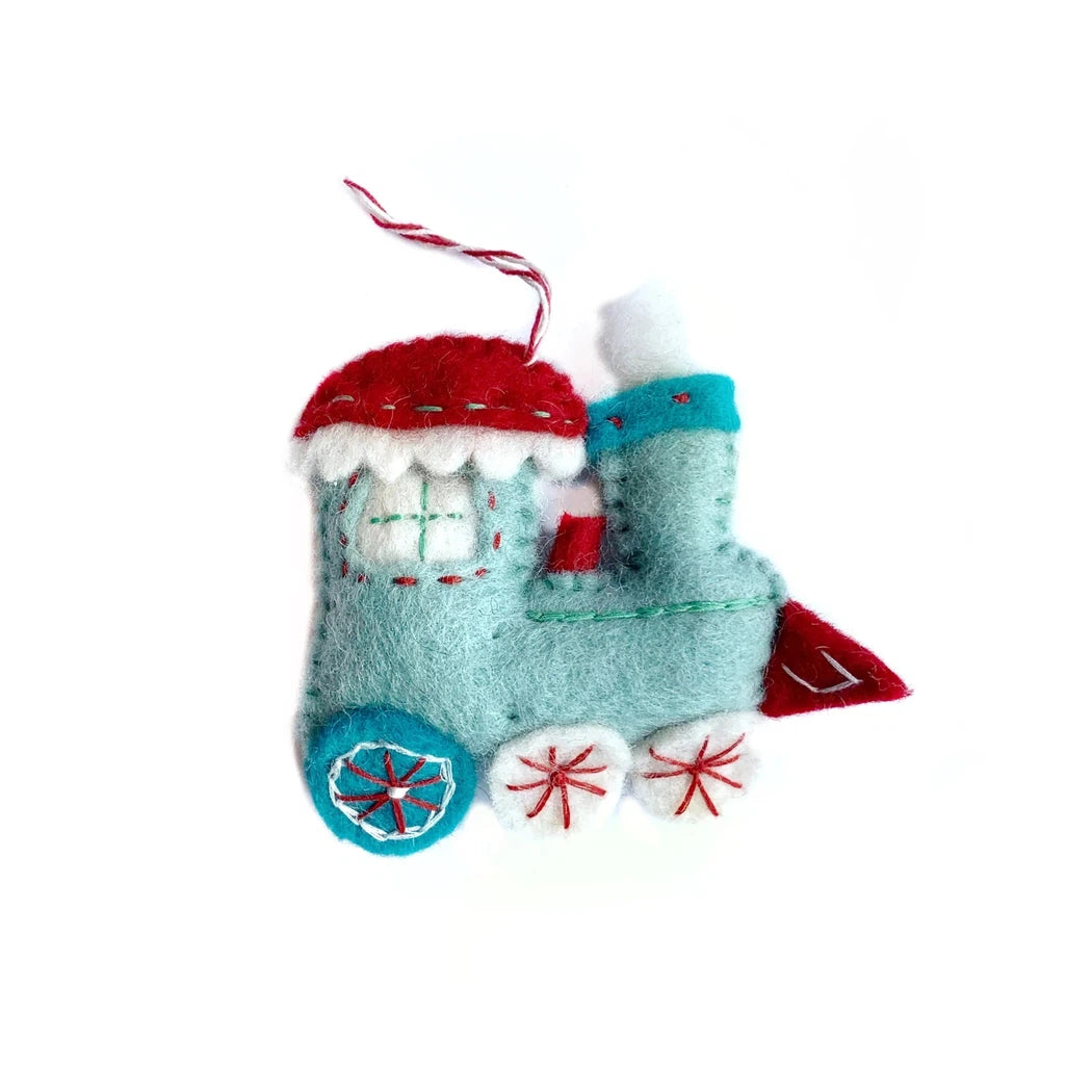 Little blue steam engine chugging down the tracks! Next stop, the North Pole! Our premium Felt Wool Christmas Train Ornament is handmade by artisans in Nepal, Asia using colorful sheep wool. This detailed blue train is has a fluffy spurt of steam puffing from its smokestack. Popular for their charming and durable designs, felted ornaments are perfect for the toughest toddler or curious critter.