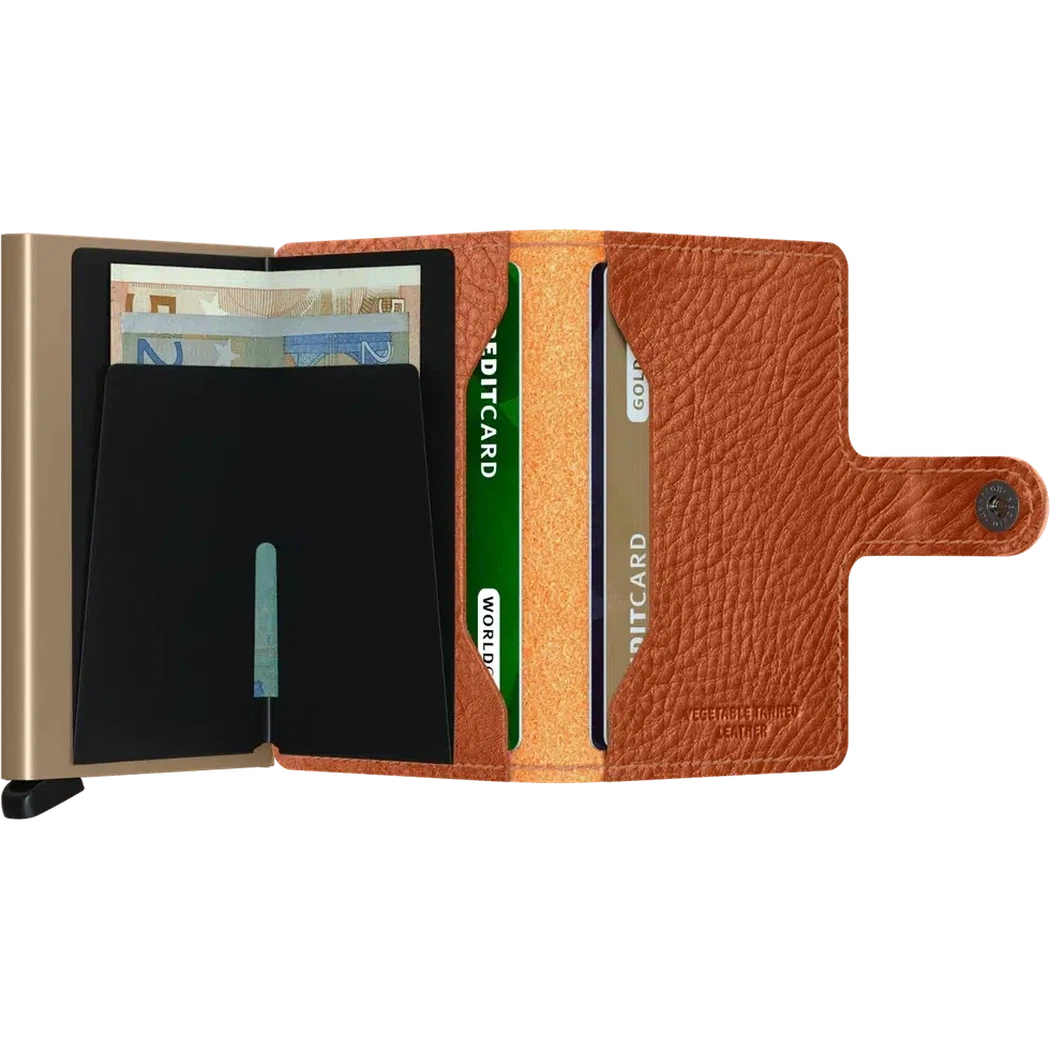 Small in size and surprisingly large in storage capacity, the Miniwallet combines the best of both worlds. The exterior holds banknotes, receipt and cards, while the aluminium Cardprotector allows you to slide out cards with one simple motion and protects them from bending, breaking and unwanted wireless communication.