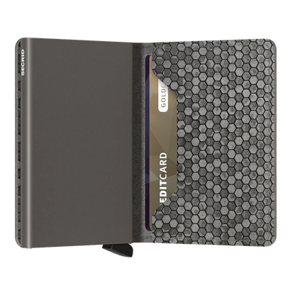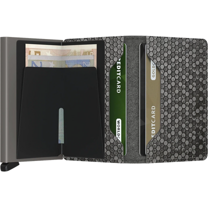 Its slim profile allows the Slimwallet to fit perfectly into any pocket. The open exterior is designed extra wide to accommodate cards, banknotes and receipts. The Cardprotector mechanism enables you to slide out cards with a simple motion, while the aluminium construction protects your cards from bending, breaking and unwanted wireless communication.