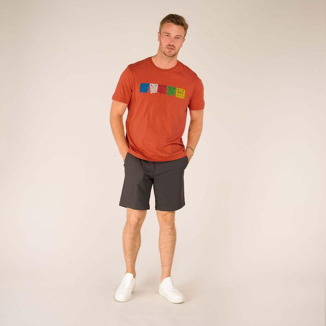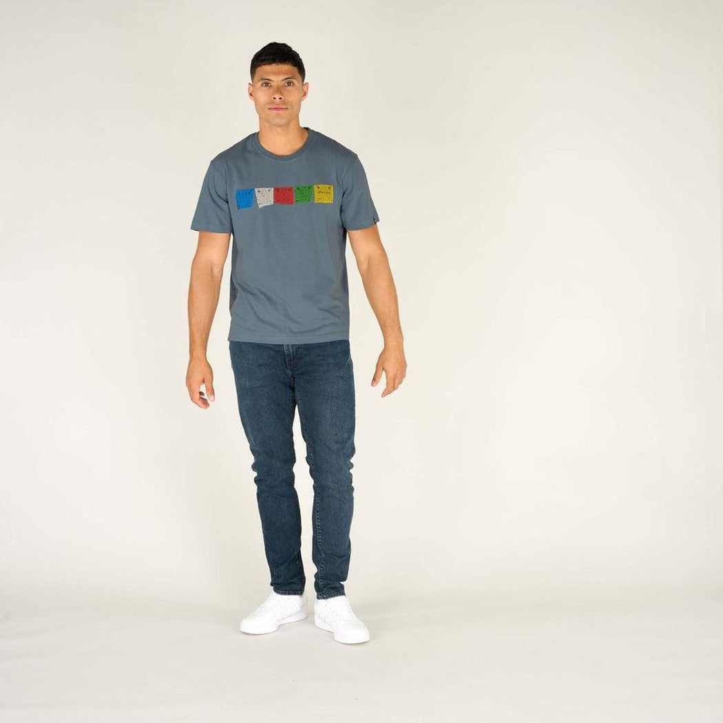 Tarcho is the name given to Tibetan prayer flags - colourful rectangular cloth, often found strung along mountain ridges and peaks high in the Himalayas. The vibrant prayer flags are depicted on the chest of this soft and durable addition to your summer wardrobe. We've also woven prayer flags into the classic crew neck of the tee to prevent it from stretching out of shape. A real dedication to the Tarcho.