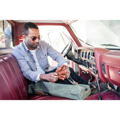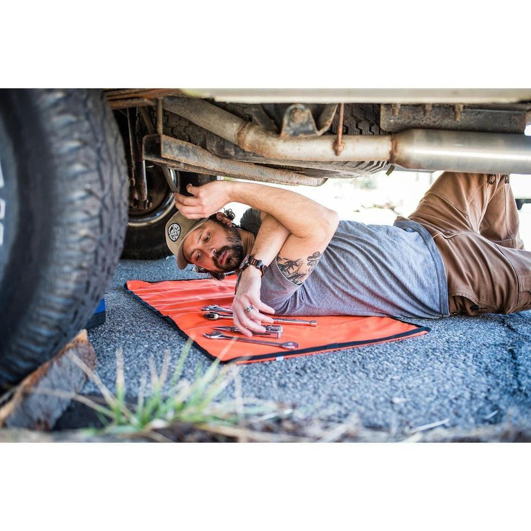 The Axe & Chore Bag was developed as a way to keep the axe secure and other maintenance items organized and at the ready. It wasn’t long before I found myself adding work gloves, flashlight, jumper cables, and any other vehicle mainstays to keep them from sliding around it the back of the truck. The offset handle design allows for a balanced carry and if you need both hands, the straps pull double duty and the bag can be worn as a pack. The included blaze orange utility mat keeps loose items visible in the field or your backside dry will changing a flat.
