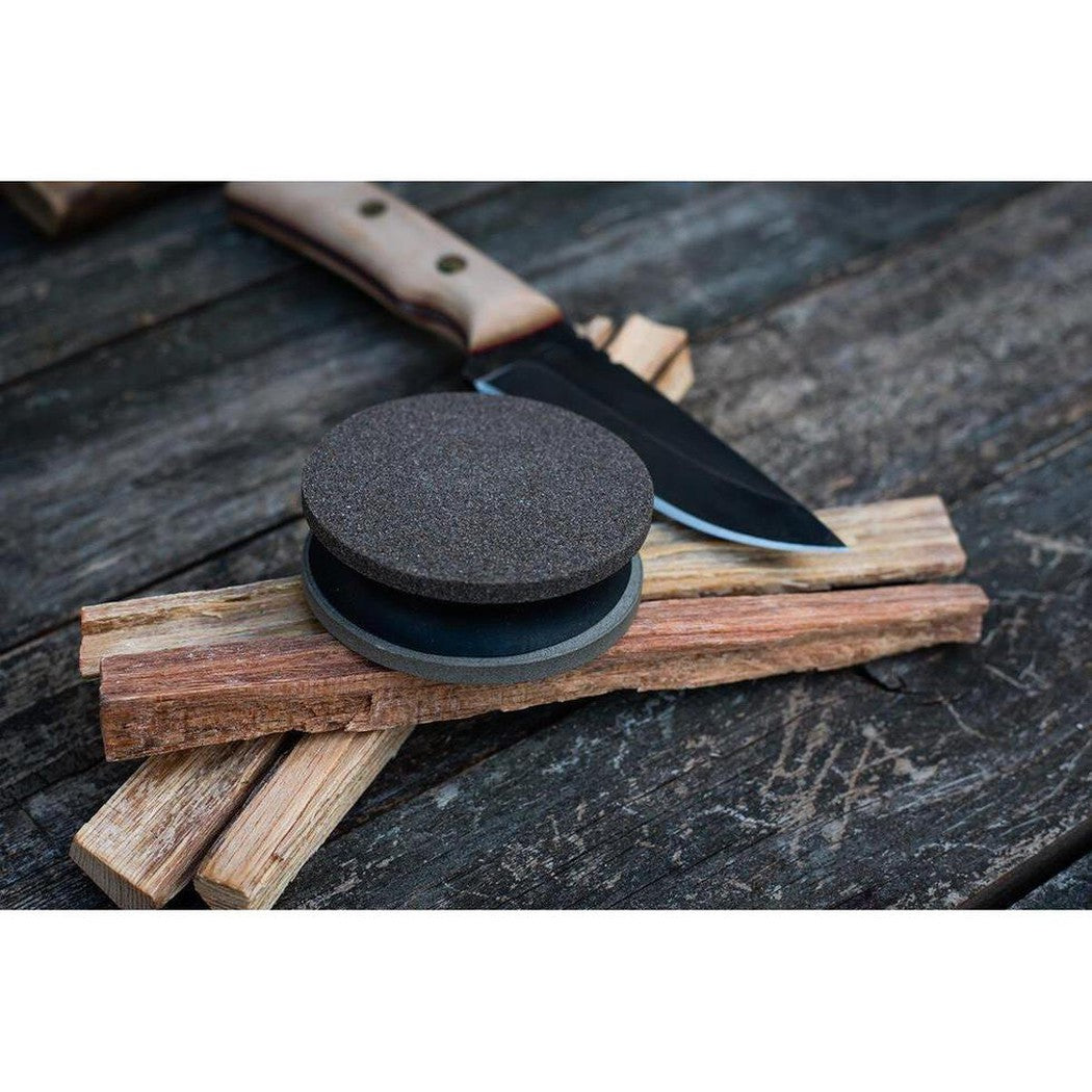 The 80 grit removes steel in a controlled manner for repairing chips and re-shaping blades from heavy use, while the 220 side refines the blade for additional sharpening, or keeping the edge maintained. It’s the perfect combination for repairing your blade by hand, without having to worry about damaging the steel’s temper on a bench grinder or other automatic sharpening device.