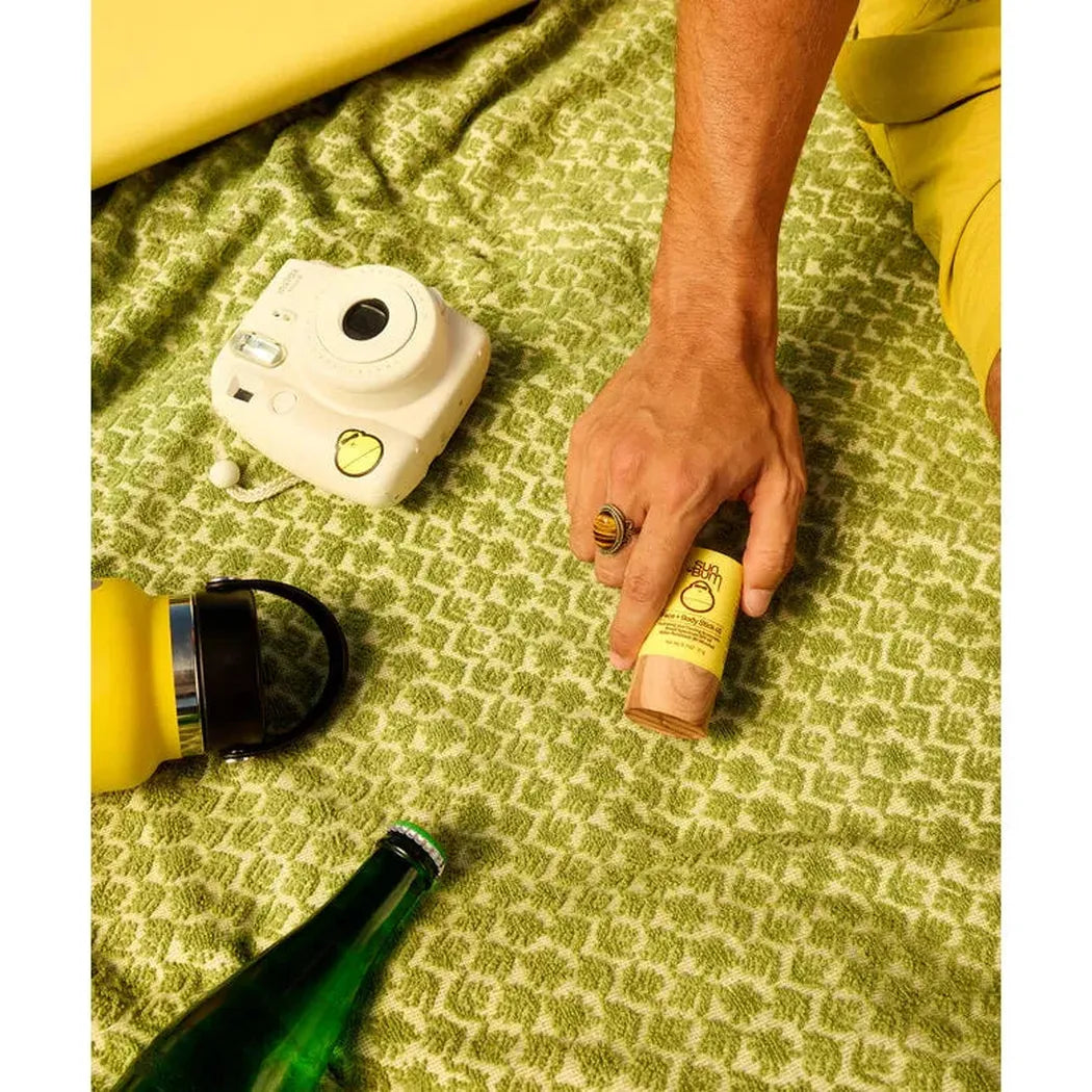The water-based formula provides a cooling, glide-on application. Plus, the easy, on-the go format provides a larger surface for face and body coverage.