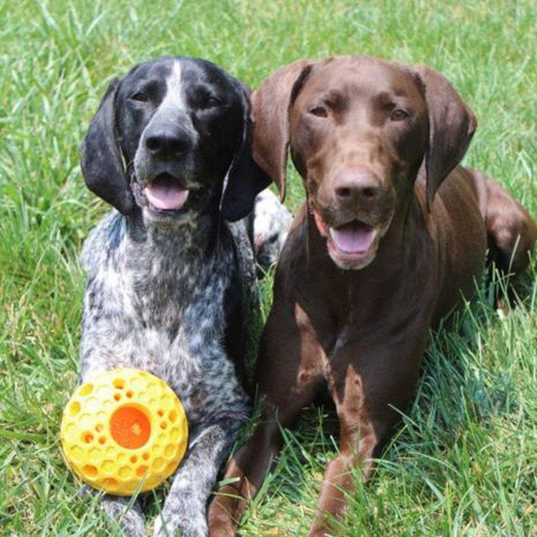 The Natural Rubber Bee Hive Reward Dog Toy is crafted from rugged and flexible natural rubber, providing a stimulating mental and physical playtime for your furry friend. Your pup can lick and nudge the toy to their heart's content while being rewarded with treats that shake out as they play. The inner retention sleeve helps keep all the treats from pouring out of the top when flipped over. This toy is perfect for dogs who enjoy a fun challenge and can easily be cleaned in the dishwasher's top rack after use.