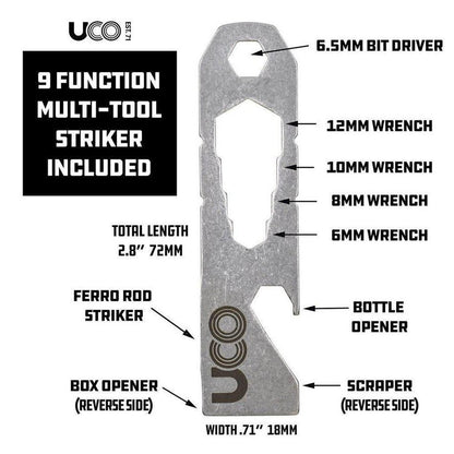 It also comes with a stainless steel striker which also is a multifunctional survival tool with 8 functions. Functions include screwdriver, bottle opener, 4 hex sizes and striker.